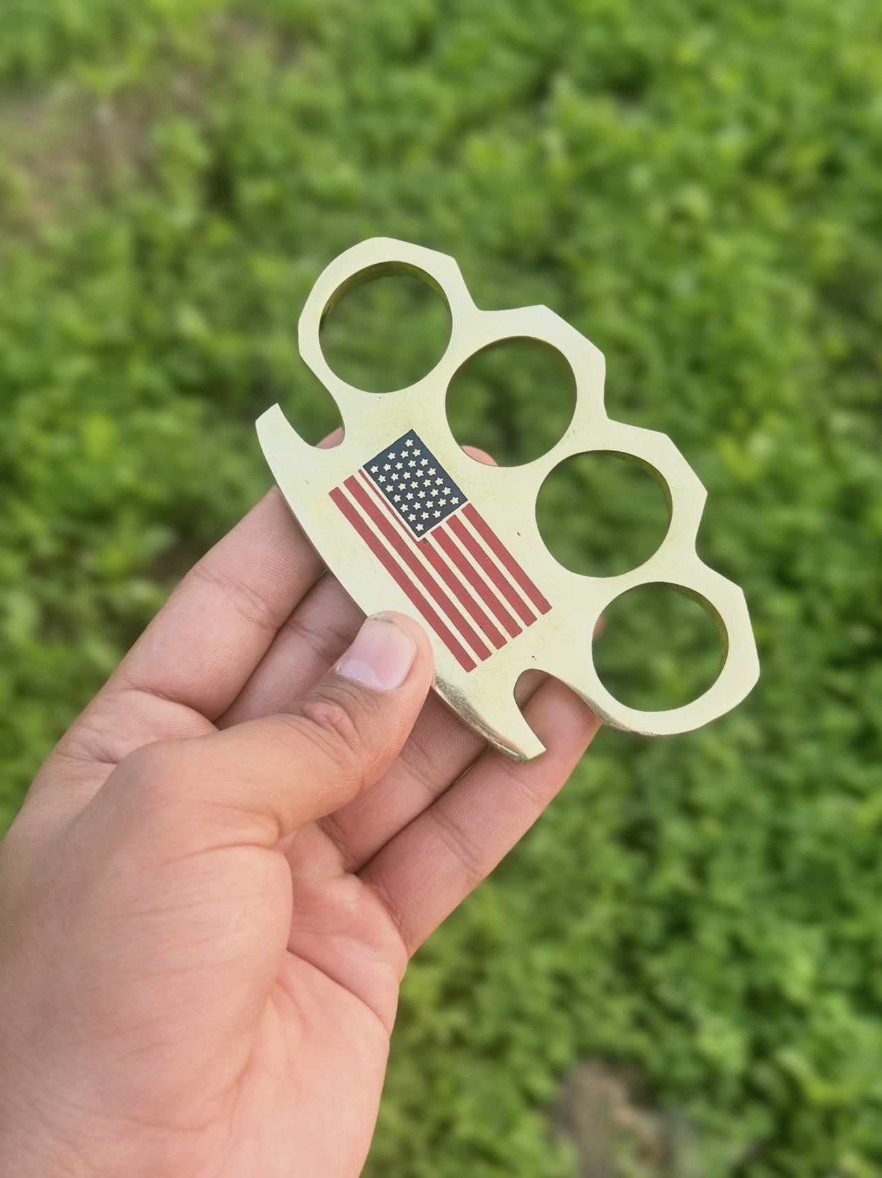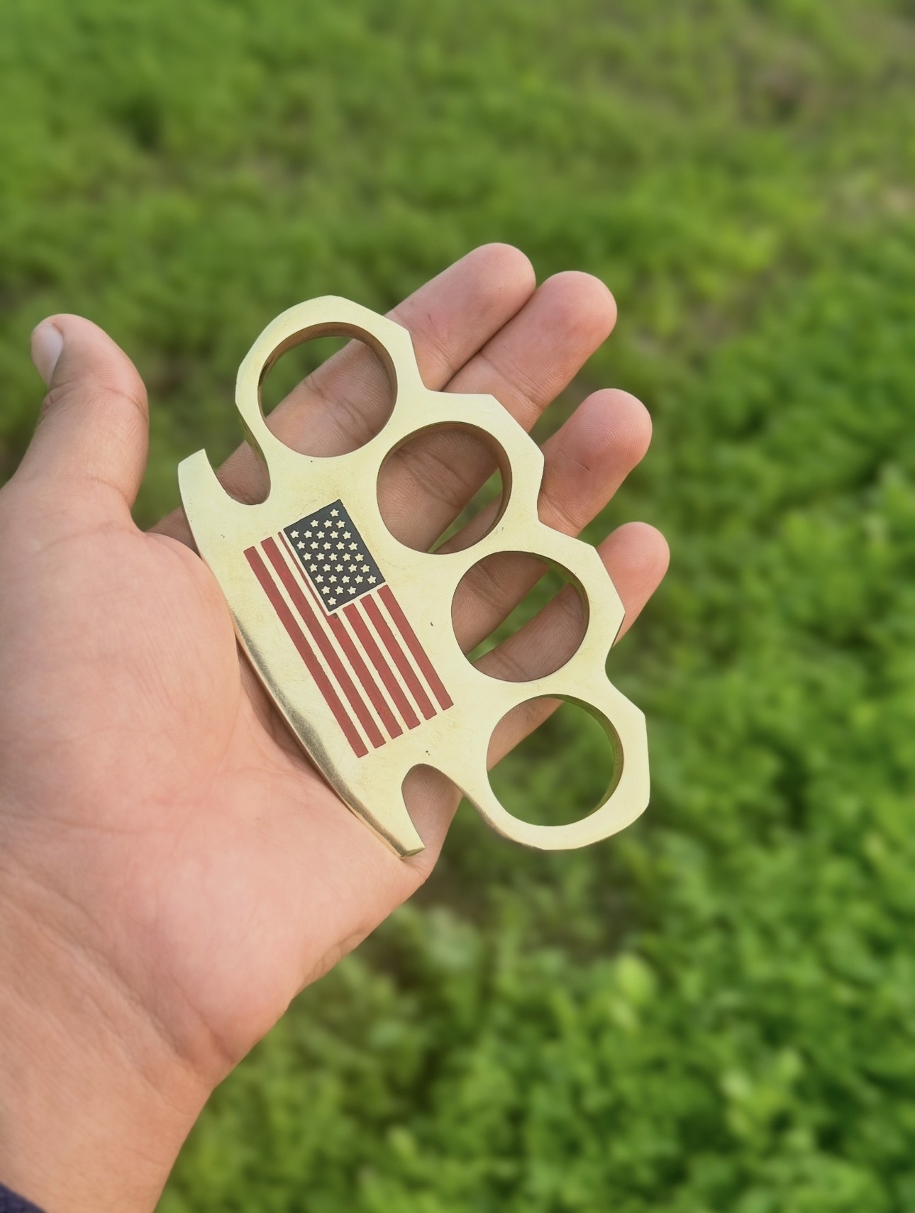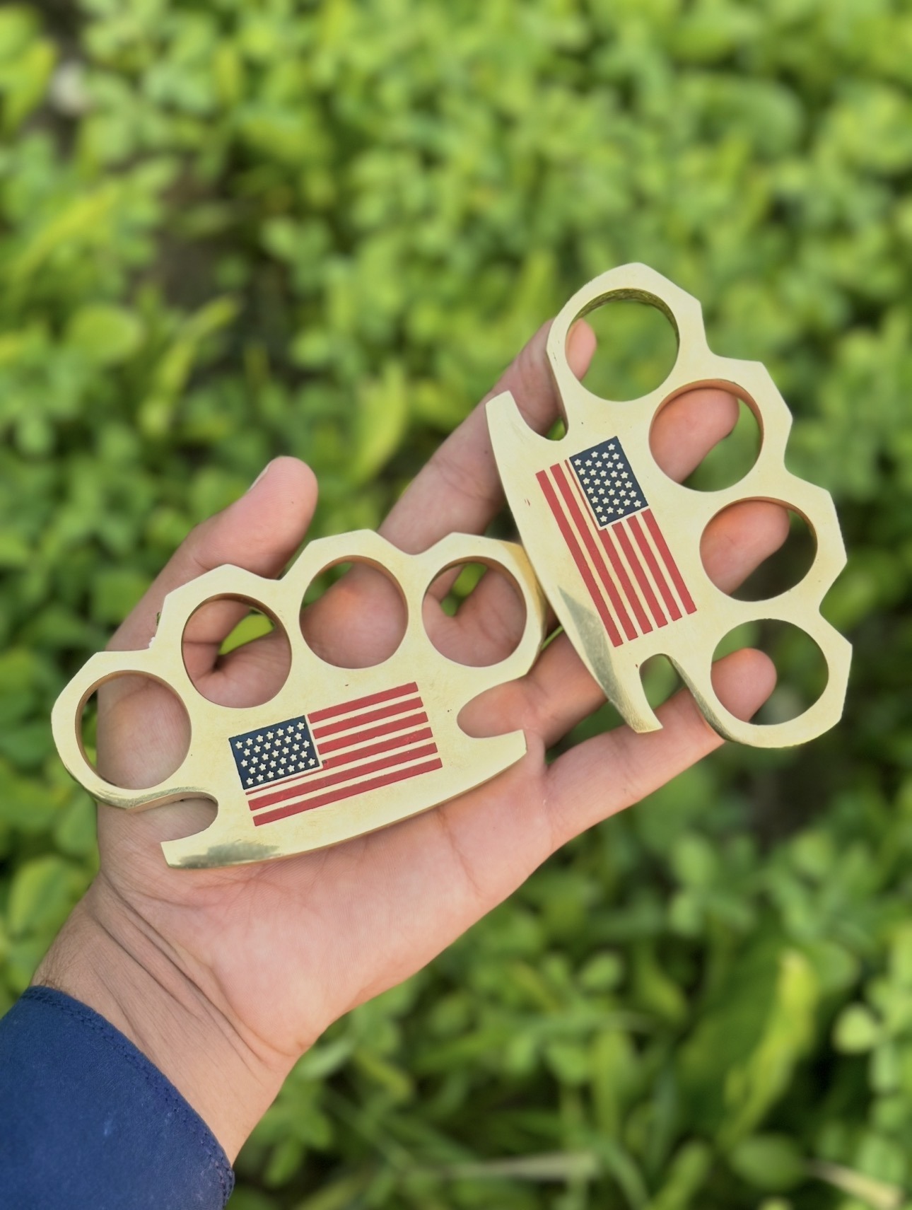 These knuckles are crafted from solid metal with a smooth, polished finish and feature a detailed American flag engraving on each piece. Designed with four evenly spaced finger holes and a curved ergonomic grip, they offer a balanced feel in the hand. The construction is durable, corrosion-resistant, and made for collectors, display, training props, or costume use. Each piece has clean edges, a sturdy build, and a consistent finish that adds to its overall presentation and craftsmanship.