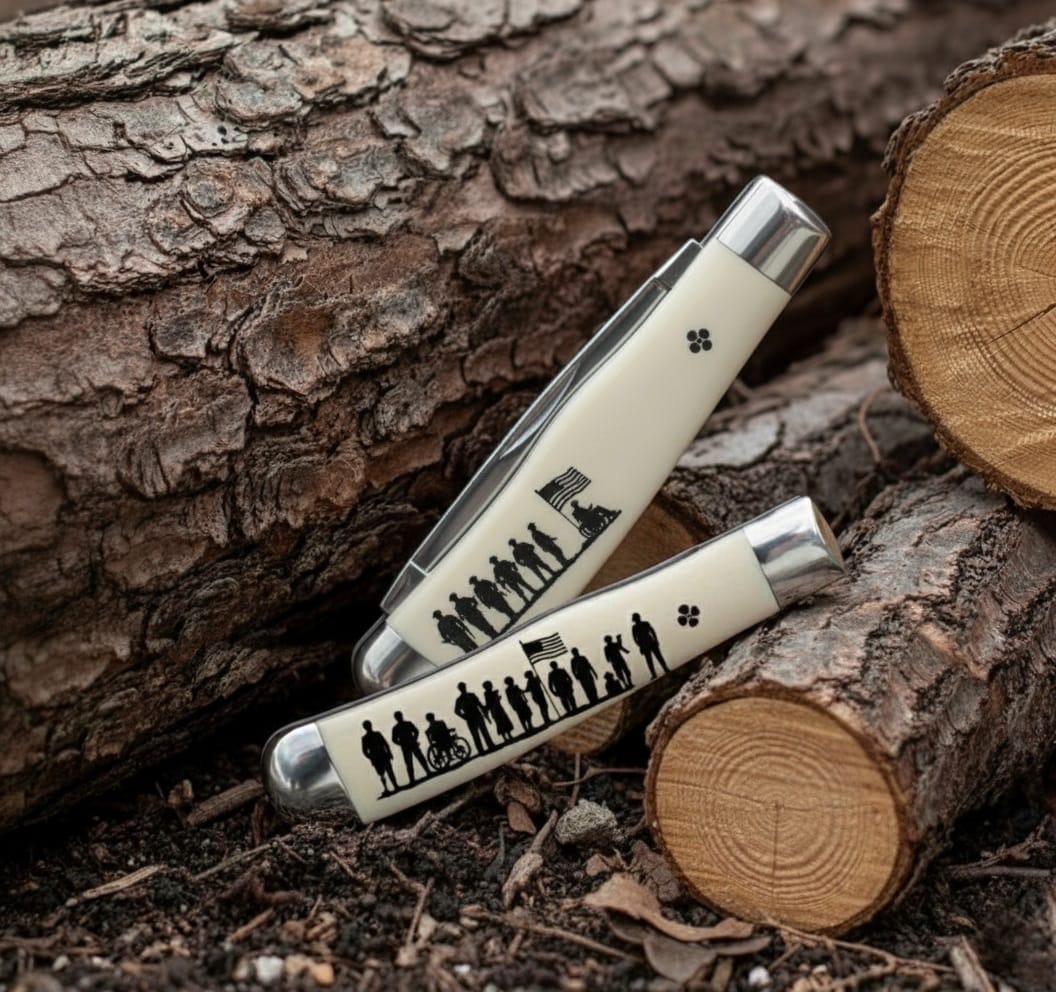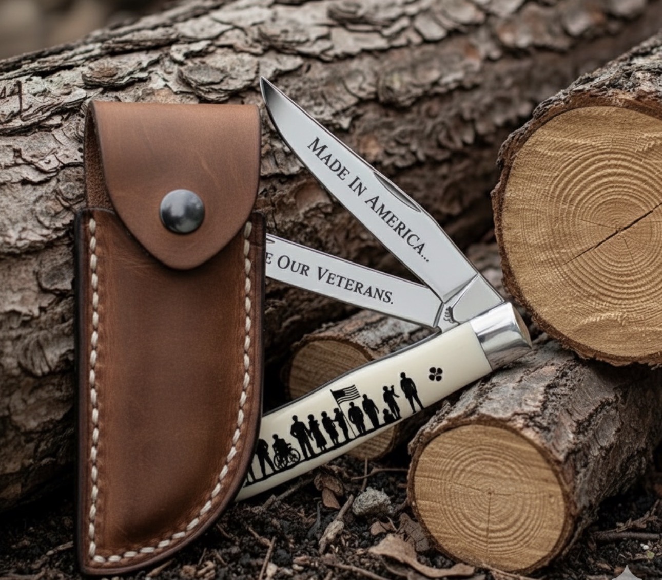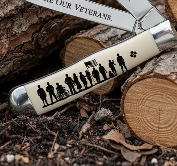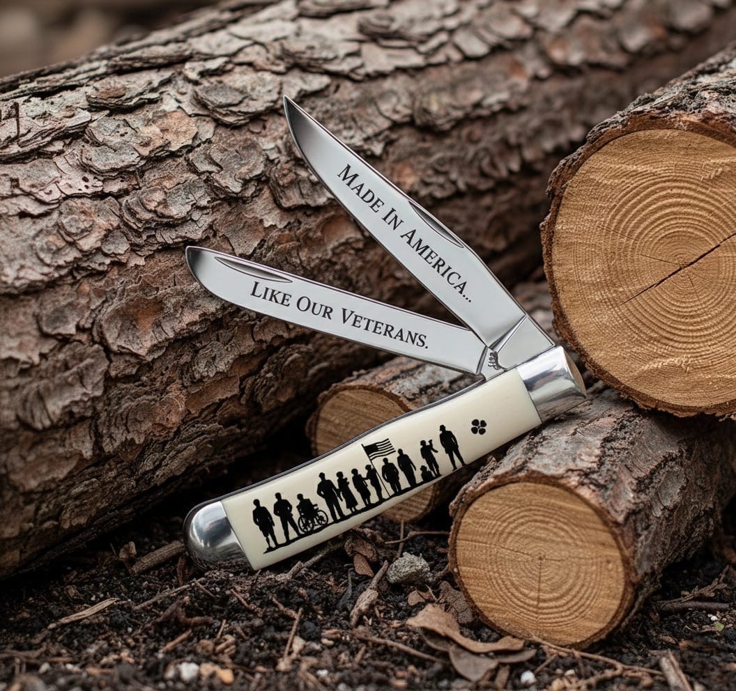 veteran-themed Trapper knife featuring two polished stainless-steel blades — a clip point and a spey blade. The main blade is etched with “MADE IN AMERICA…” and the second with “LIKE OUR VETERANS.” The handle has a cream/ivory finish with a silhouette tribute design showing veterans, service members, and an American flag. Nickel-silver bolsters and a sturdy slip-joint lock give it a classic, durable build. Perfect as a patriotic gift or collector’s piece.