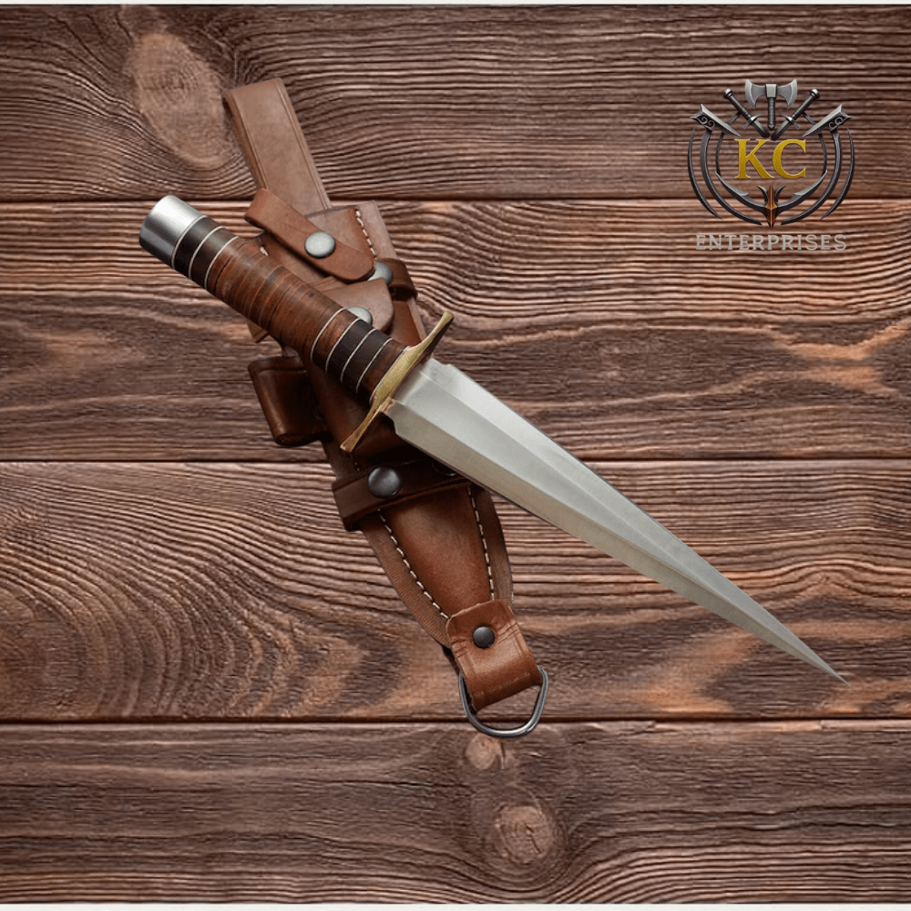 Long triangular dagger with a flat-ground blade that runs to a fine point, a slender brass crossguard, and a stacked leather washer handle capped with an aluminum pommel. Rides in a brown leather sheath with snap keeper and a lower D-ring for lash/hang options.