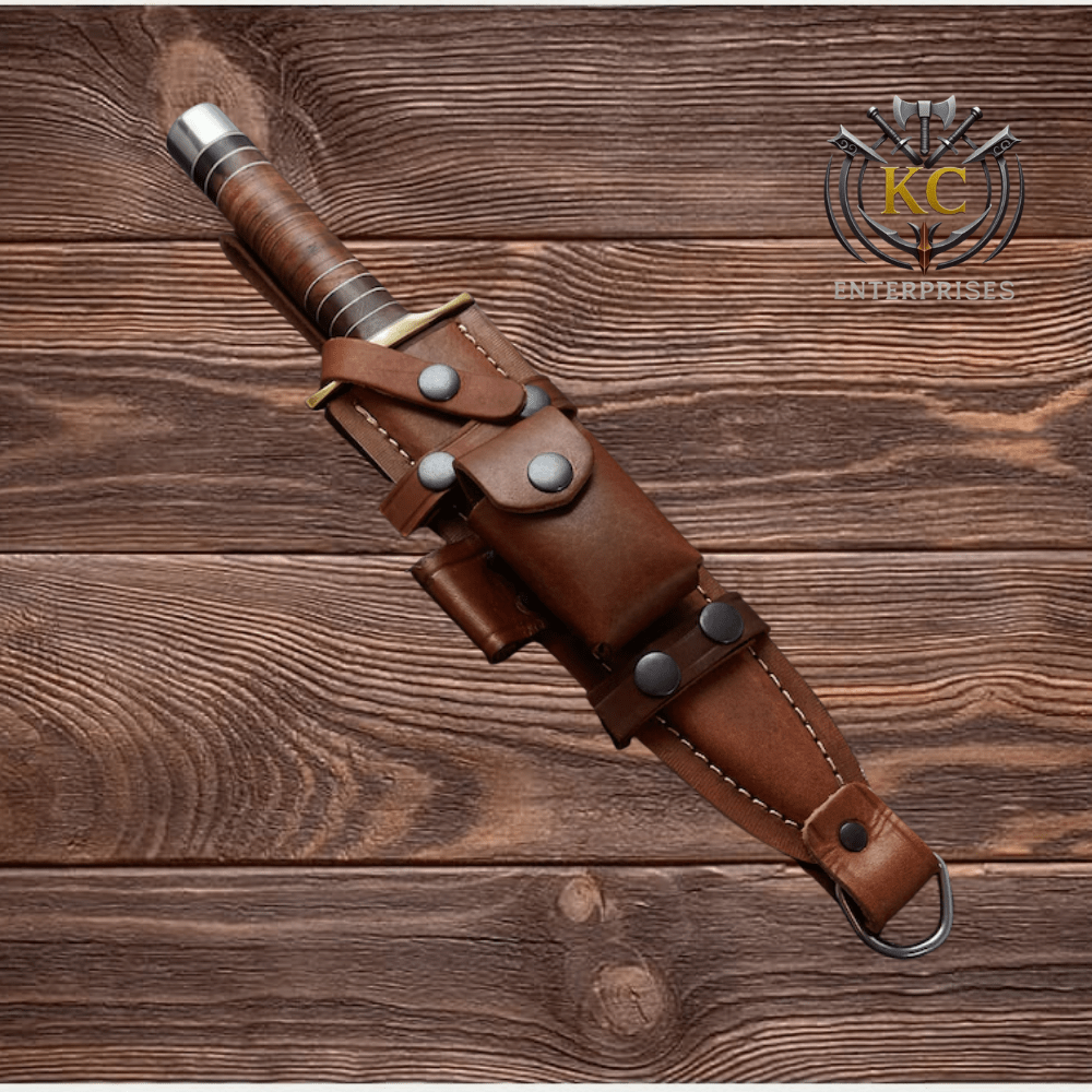 - Leather sheath with snap strap and D-ring; cream stitch edges