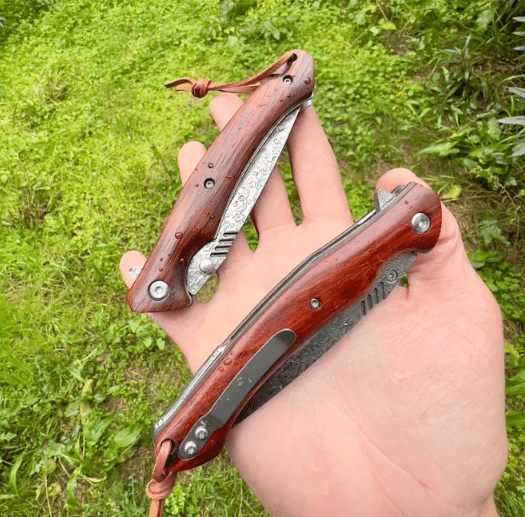 Damascus steel folding knife wooden handle camping personalized men’s gift pocket