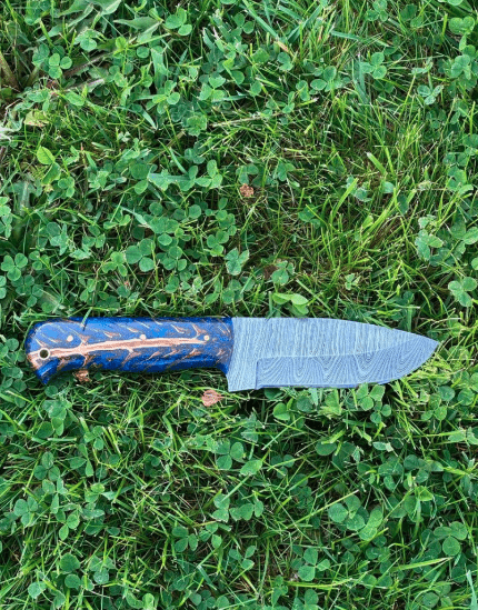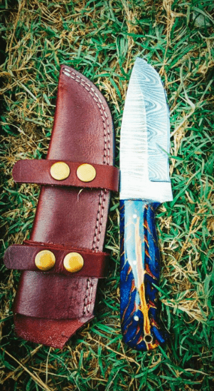 This handmade blue handled skinning knife features a total length of 9 inches, with an 4.5″ inches blade crafted from Damascus steel. Handle is made of resin and perfectly designed for stronger grip. We offer personalization and engrave both initials and logo on the blade. it is a perfect Christmas present. It comes with genuine hand stitched leather belt sheath for safe placing.
