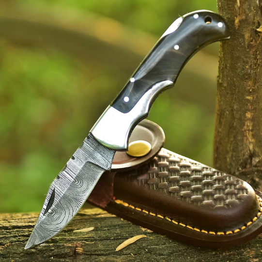 This custom Damascus steel folding knife is a perfect blend of craftsmanship and functionality. Designed for collectors, hunters, and outdoor enthusiasts, this knife features a unique resin handle for a comfortable grip and a beautifully forged Damascus blade that ensures durability and sharpness.