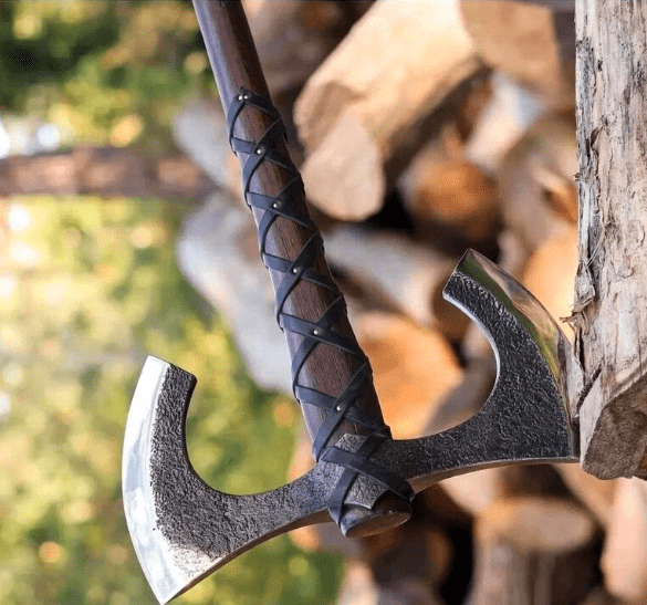 Featuring a premium wooden handle with leather wrap, this Viking axe combines rugged performance with timeless style. It includes a handmade genuine leather sheath for safe carrying and display. Whether used for camping, wood chopping, or as a striking display piece, this carbon steel Viking axe is built to impress both modern craftsmen and lovers of Viking heritage.