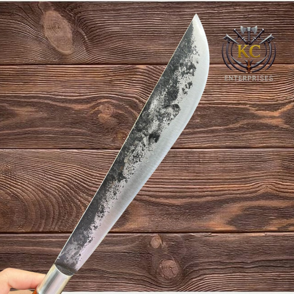 The dark, uneven area along the blade looks like a forged or “kurouchi” finish. This finish keeps part of the black scale from the forging process, giving it a rustic appearance and helping resist corrosion.