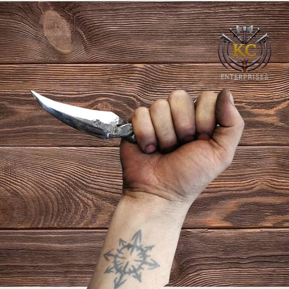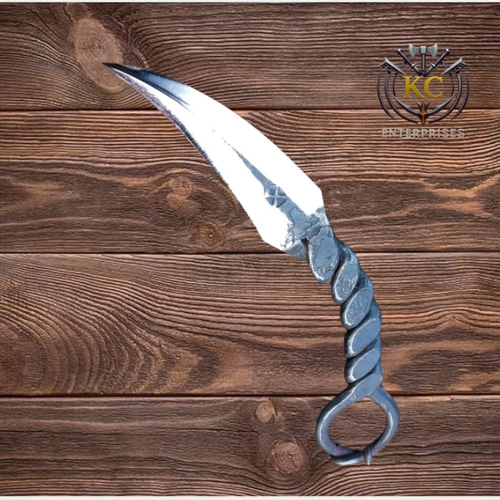 This unique hand-forged mini karambit knife is a perfect blend of traditional blacksmith craftsmanship and modern tactical design. Featuring a beautifully curved blade and a distinctive twisted metal handle, this knife stands out as both a functional tool and a striking collectible piece.