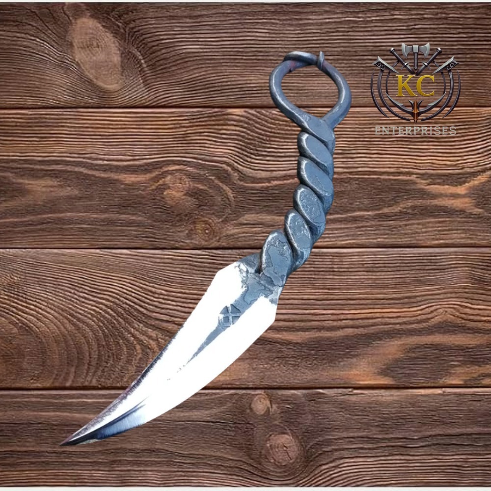 The handle is crafted from solid forged steel with an artistic twisted pattern that provides both strength and a comfortable grip. The integrated finger ring at the end of the handle ensures better control, stability, and secure handling during use.