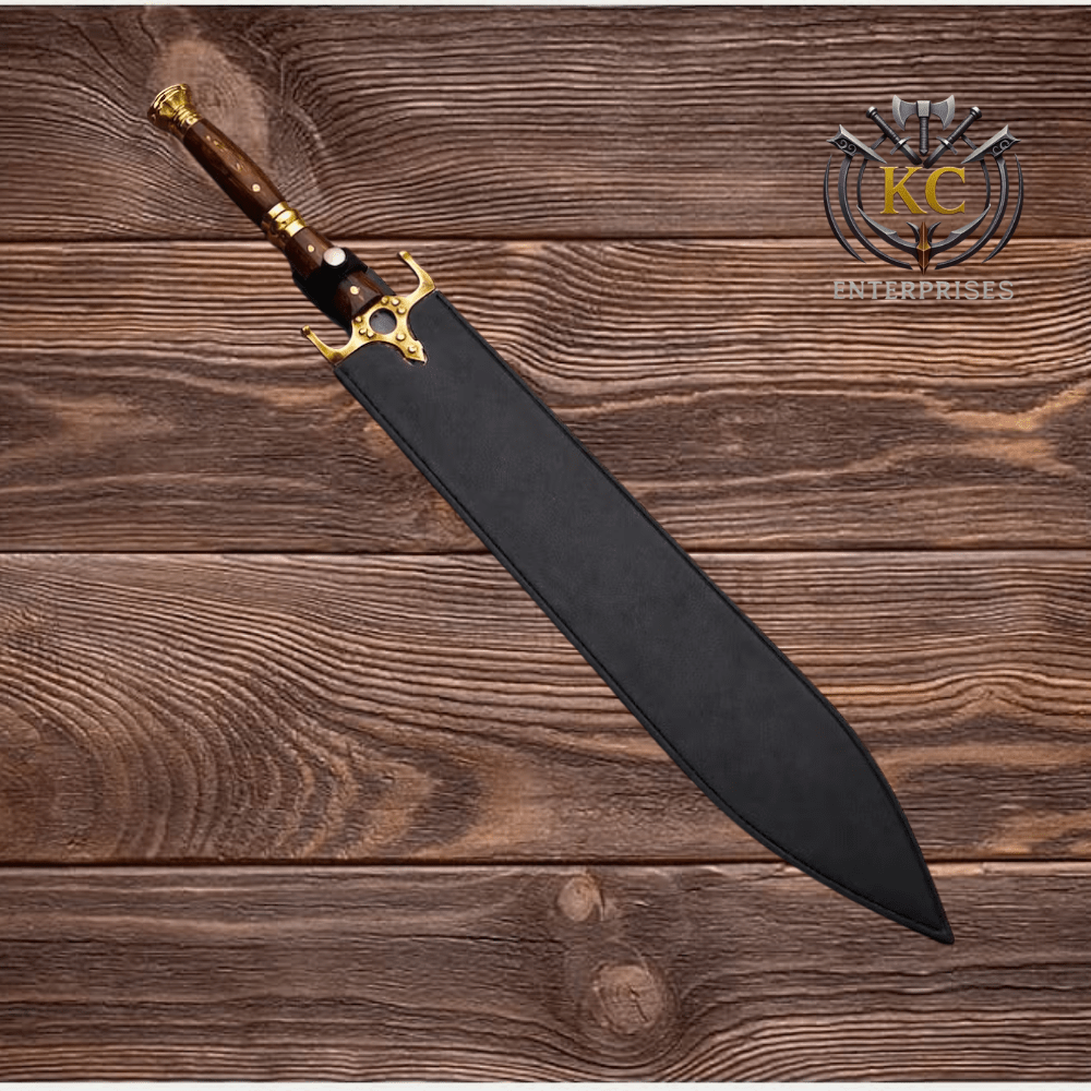 • Minimal black leather scabbard; snap-tab belt loop
