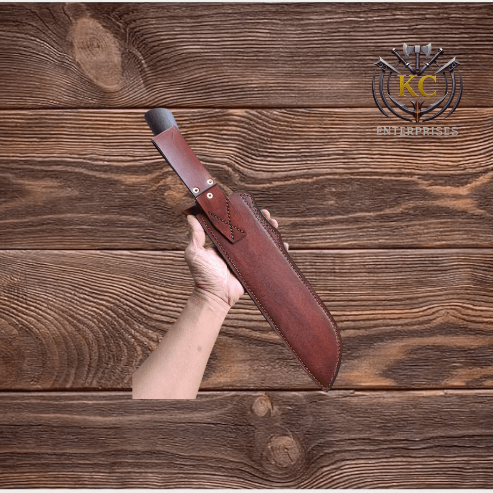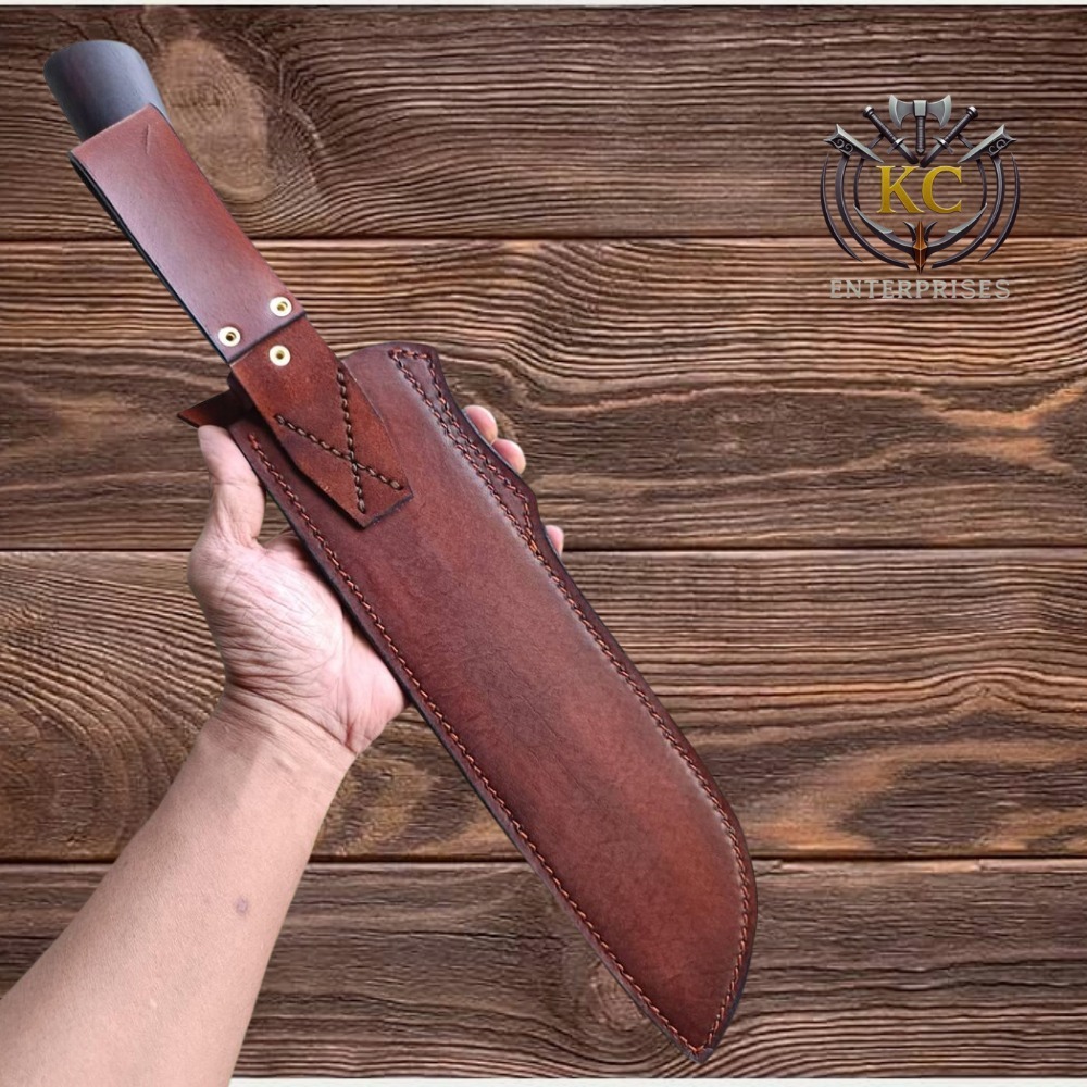 The machete comes with a premium handmade leather sheath featuring durable stitching and a secure belt loop, allowing for safe storage and convenient carrying during outdoor adventures.