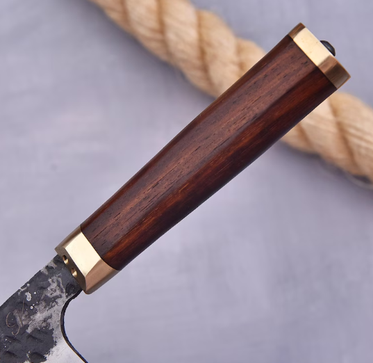 The handle is made from a combination of Arizona Ironwood, imitation ivory and patinated brass. The combination is stunning!