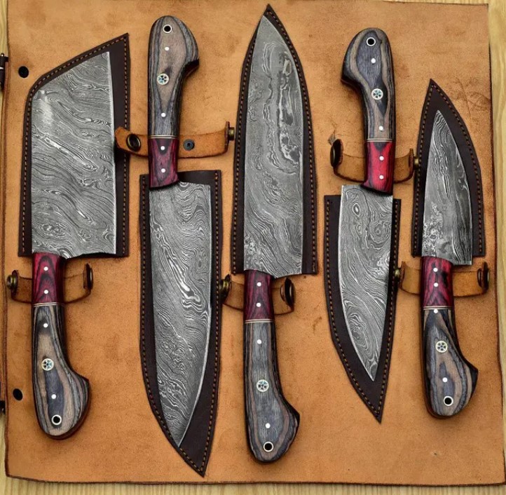 Custom Handmade Damascus Chef Set 5 Pieces Handle Wood /Anniversary Gift, Gift For Chef With Leather Cover, Chef Knife Set, Kitchen Knife, Serbian Knife, Japeness Knife, Gift For her, Gift For Mother, Gift For Girl Friend, Gift For Wife, 6th 8th 30th Anniversary Gift