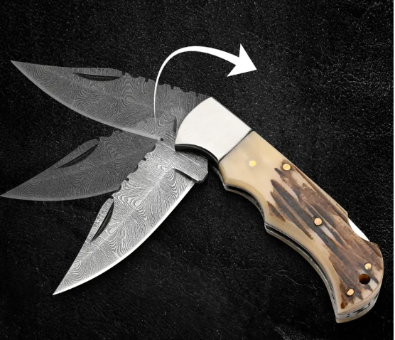 Handmade Damascus Steel Folding Knife: Stag Horn Handle, Leather Sheath