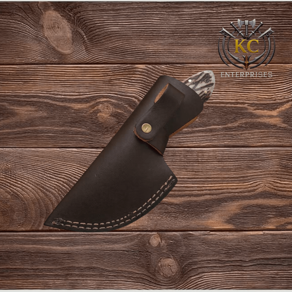 To complement the knife, it comes with a premium handmade leather sheath featuring strong stitching and a secure snap closure. The sheath protects the blade and allows convenient belt carry, making it perfect for field use.
