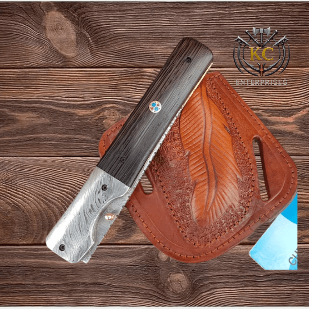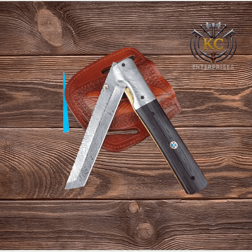 - Hand-forged Damascus blade and back spring with visible layer pattern