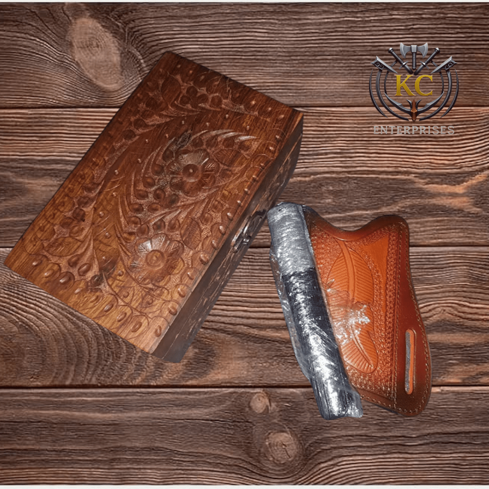 - Sheath: tooled leather, belt carry