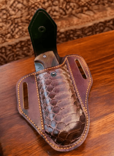 The handle is crafted from natural walnut wood, providing a warm, ergonomic grip. What truly sets this knife apart is its genuine python and cowhide leather sheath – an exotic and rugged addition that protects your knife in style.